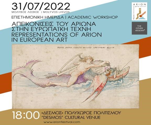 Η ποιητική παράδοση για τον Αρίωνα ενέπνευσε εικαστικές απεικονίσεις του στην αρχαιότητα. Στους νεότερους χρόνους,  από την Αναγέννηση μέχρι και τον 19ο αιώνα, καλλιτέχνες αποτύπωσαν, επίσης, γεγονότα της ζωής του σε ποικίλα εικαστικά μέσα. Στην ημερίδα θα παρουσιαστούν  έργα της ευρωπαϊκής τέχνης που άντλησαν έμπνευση από την μορφή  του Αρίωνα, θα αναδειχθεί το πολιτιστικό, ιστορικό και κοινωνικό περιβάλλον εντός του οποίου δημιουργήθηκαν και θα διερευνηθεί η πρόσληψη του μύθου μέσα από ποικίλες αναγνώσεις.