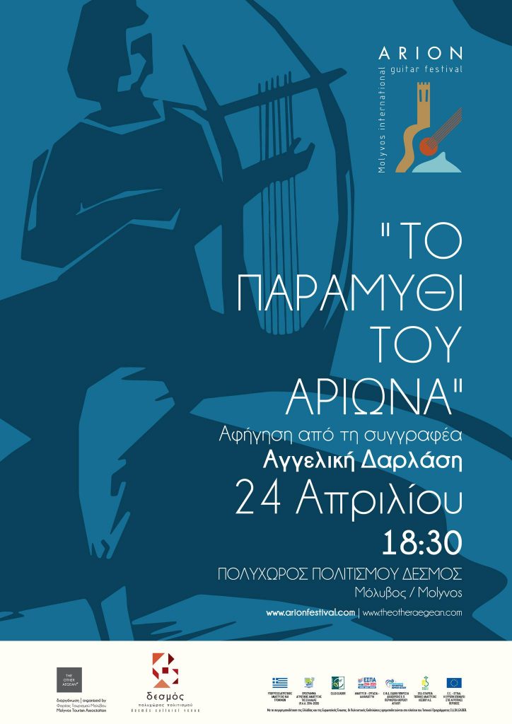 Το Παραμύθι του Αρίωνα.Την Δευτέρα 24 Απριλίου ολοκληρώθηκε με μεγάλη συμμετοχή παιδιών, δασκάλων κτλ., η εκδήλωση παρουσίασης και αφήγησης παραμυθιού που αφορά τον Αρίωνα τον κιθαρωδό. Ένα παραμύθι για τον Αρίωνα, την Μήθυμνα της Λέσβου, τον Απόλλωνα.Με βάση το κείμενο του Ηροδότου για τον Αρίωνα, η συγγραφέας Αγγελική Δαρλάση απέδωσε σε έμμετρο κείμενο την ιστορία, με τα παιδιά να μαθαίνουν διασκεδάζοντας τις εμπειρίες από την ζωή και το μακρινό ταξίδι του Αρίωνα του κιθαρωδού.Η μετέπειτα συζήτηση του παραμυθιού ήταν απολαυστική, με τα παιδιά να σχολιάζουν την ιστορία και την συγγραφέα να απαντά στις ερωτήσεις τους.Η εκδήλωση έγινε στο πλαίσιο των εκδηλώσεων του “Αρίων” Διεθνούς Φεστιβάλ Kιθάρας Μολύβου, με την συγχρηματοδότηση του προγράμματος CLLD/LEADER και είχε την υποστήριξη της Εταιρείας Τοπικής Ανάπτυξης Λέσβου (ΕΤΑΛ ΑΕ).Περισσότερες πληροφορίες για την Διοργάνωση στο κάτωθι link:Αρίων Διεθνές Φεστιβάλ Κιθάρας Μολύβου: http://www.arionfestival.com/
