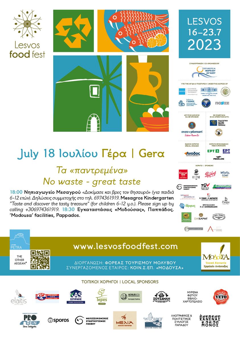 Σήμερα 18/07 ραντεβού στην Γέρα!Η Κοιν.Σ.Επ. «Μοδούσα» στην 4η συμμετοχή της στο φεστιβάλ θα μας παρουσιάσει «τα παντρεμένα».18:00 Νηπιαγωγείο Μεσαγρού«Δοκίμασε και βρες τον θησαυρό» (δράση για παιδιά 6-12 ετών). Δηλώσεις συμμετοχής στο τηλέφωνο 6974361919.18:30 Εγκαταστάσεις «Μοδούσας», Παππάδος.Αξιοποίηση των υπόλοιπων στην κουζίνα μας, μια παράδοση του τόπου μας, λόγω ανάγκης τις περισσότερες φορές, και όχι μόνο. «Τα παντρεμένα» θα τα εντάξουμε μέσα σε ένα ευρύτερο πλαίσιο, πετάμε λιγότερα, ανακυκλώνουμε, μετατρέπουμε άχρηστα σε χρήσιμα, προστατεύουμε το περιβάλλον.Στο χώρο της εκδήλωσης θα βρίσκονται τοπικοί σύλλογοι και chef, μάγειρες και μαγείρισσες, καλλιτέχνες και δημιουργοί που καταφέρνουν με υλικά διαλογής να δημιουργούν νέα εικαστικά και χρηστικά αντικείμενα. Η αξιοποίηση των leftovers είναι δημιουργία, απόλαυση εδώ στο μαγικό νησί! Το Lesvos Food Fest διοργανώνεται από τον Φορέα Τουρισμού Μολύβου σε συνδιοργάνωση με την Περιφέρεια Βορείου ΑιγαίουΕπίσης, τελεί υπό την αιγίδα και ευγενική υποστήριξη του ΕΟΤ, της Γενικής Γραμματείας Αιγαίου & Νησιωτικής Πολιτικής, του ΝΠΔΔ Πολιτισμού, Τουρισμού και Αθλητισμού του Δήμου Δυτικής Λέσβου, της ΓΣΕΒΕΕ, του Επιμελητήριο Λέσβου, της ΠΟΕΣΕ, του Συνδέσμου Ποτοποιών Αποσταγματοποιών Λέσβου και πλαισιώνεται και στηρίζεται δυναμικά από διάφορους φορείς και χορηγούς.Αργυρός Χορηγός: Ούζο Πλωμαρίου Ισιδώρου Αρβανίτου Ειδικός Χορηγός: Άνοδος Εκπαιδευτική – Συμβουλευτική Σε συνεργασία με το Πολιτιστικό Ίδρυμα Ομίλου ΠειραιώςΧορηγοί Επικοινωνίας: ΕΡT Αιγαίου, ΕΡΤ3 & Aeolos TV