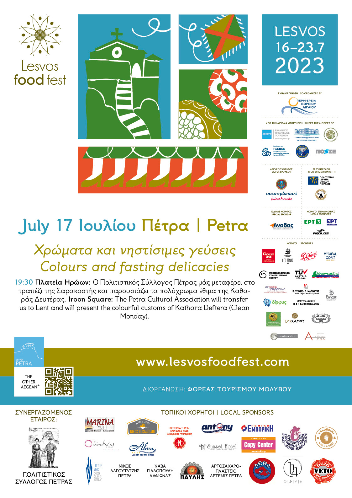Το Lesvos Food Fest διοργανώνεται από τον Φορέα Τουρισμού Μολύβου σε συνδιοργάνωση με την Περιφέρεια Βορείου Αιγαίου